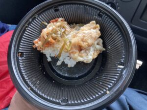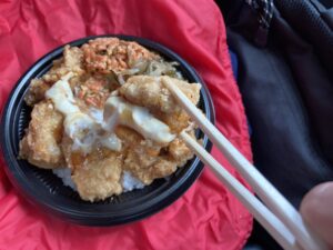 御覧ください、このパンパンに詰まったどんぶりを。チキンがフタに潰されて、